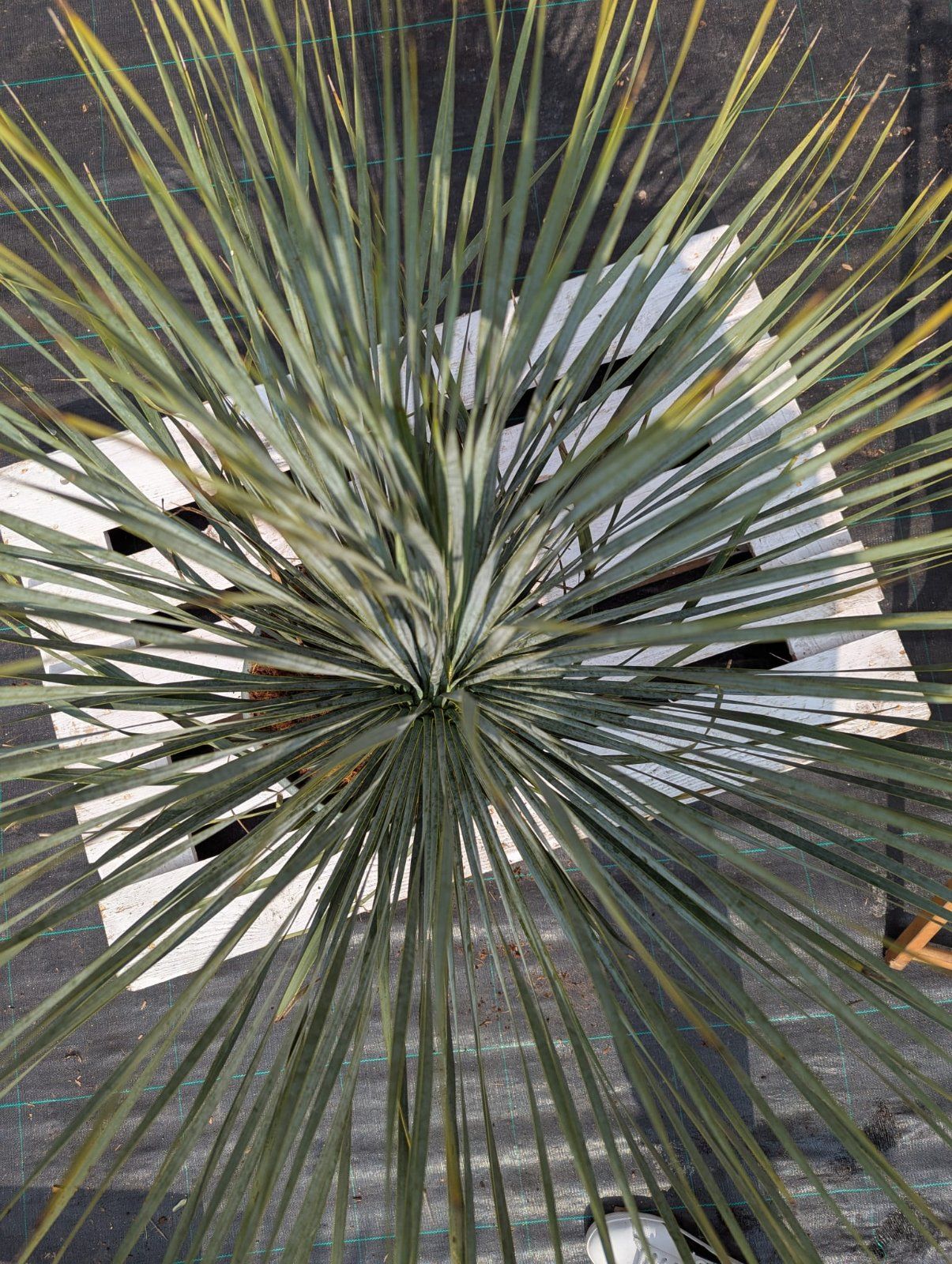 Markante Wüsten-Yucca mit strahlenförmig angeordneten, schmalen, silberblauen Blättern und modernem, architektonischem Erscheinungsbild. Das angebotene Exemplar hat eine Lieferhöhe von 90–120 cm (inkl. Topf) und zeigt bereits einen gut sichtbaren Stammansatz – ideal als zukünftiger Solitär für sonnige, trockene Standorte.