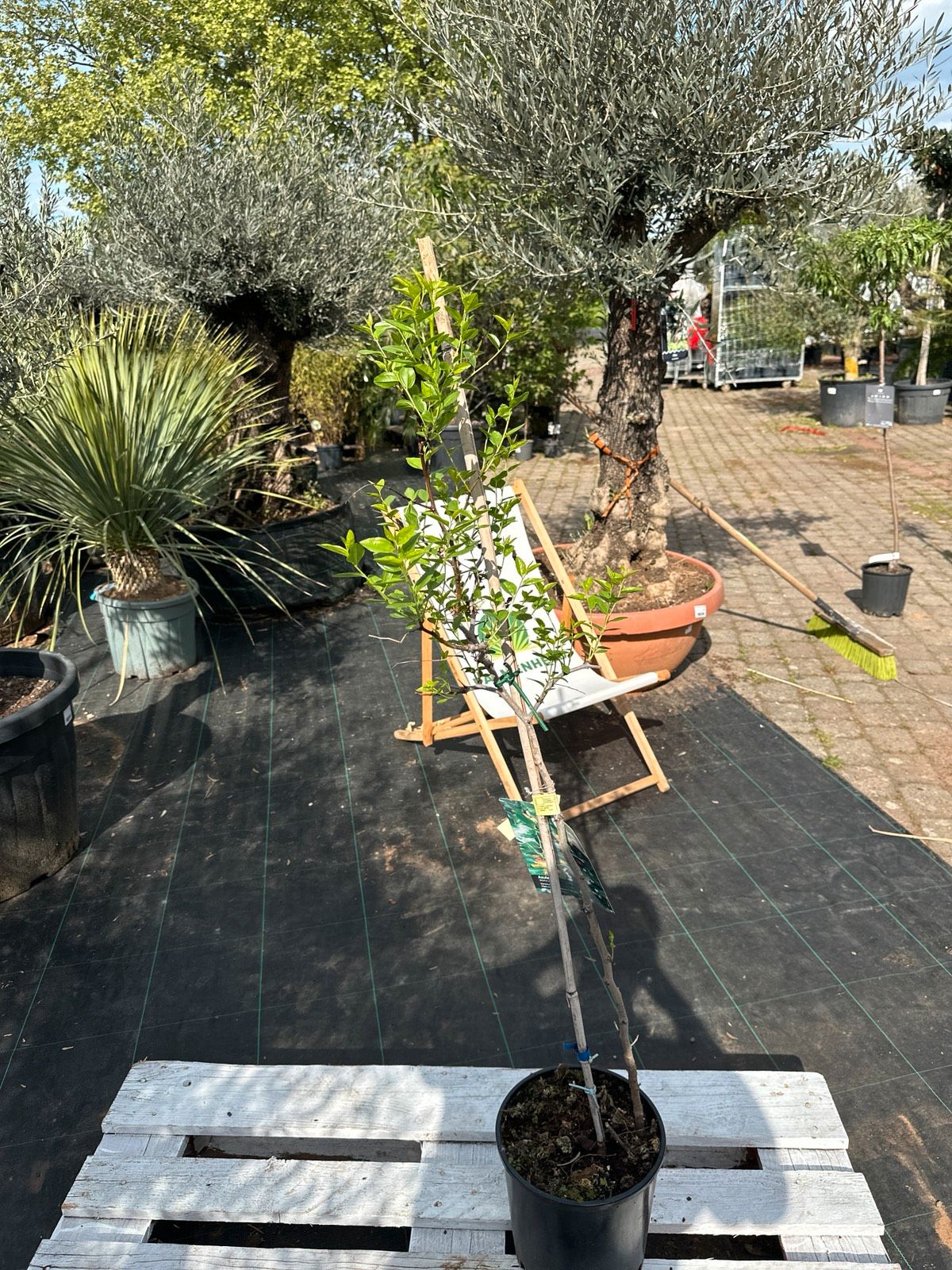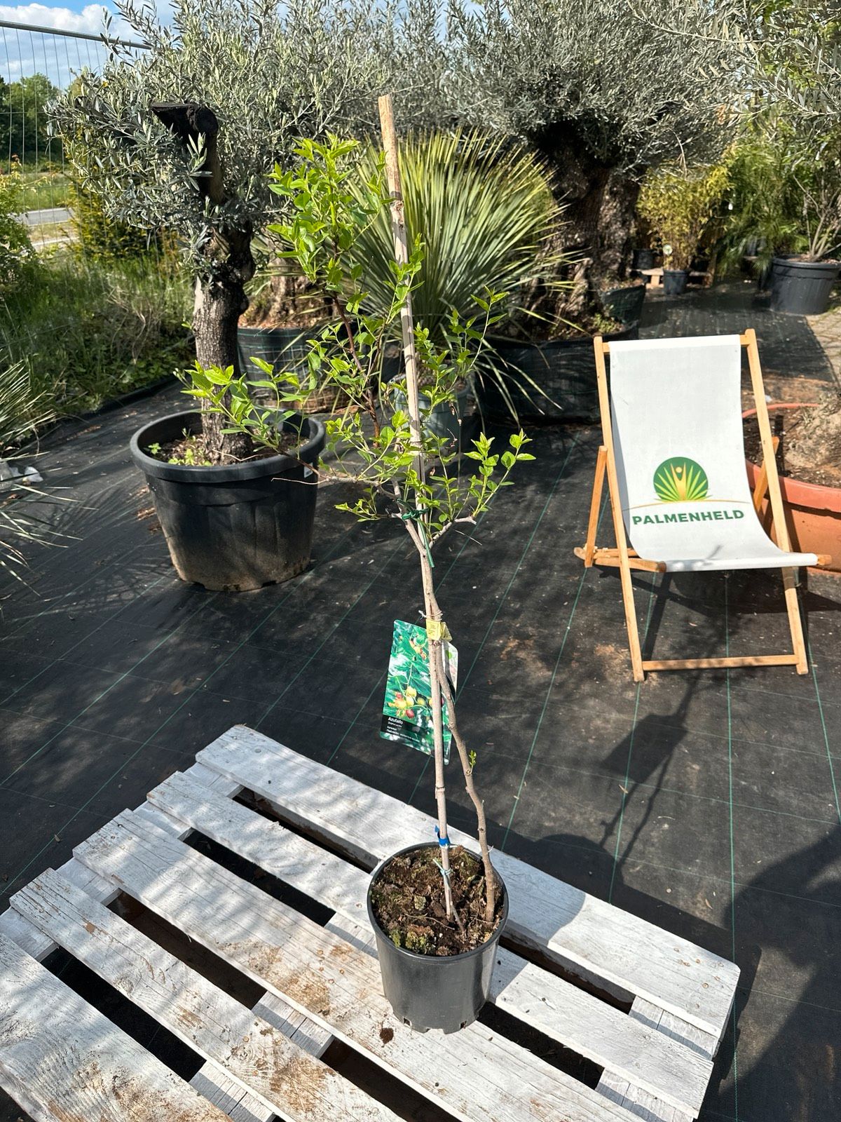 Exotisches Obstgehölz mit süß-aromatischen Früchten und dekorativer Herbstfärbung – ideal für Garten und große Kübel an warmen, sonnigen Standorten. Lieferhöhe 120–140 cm (inkl. Topf).