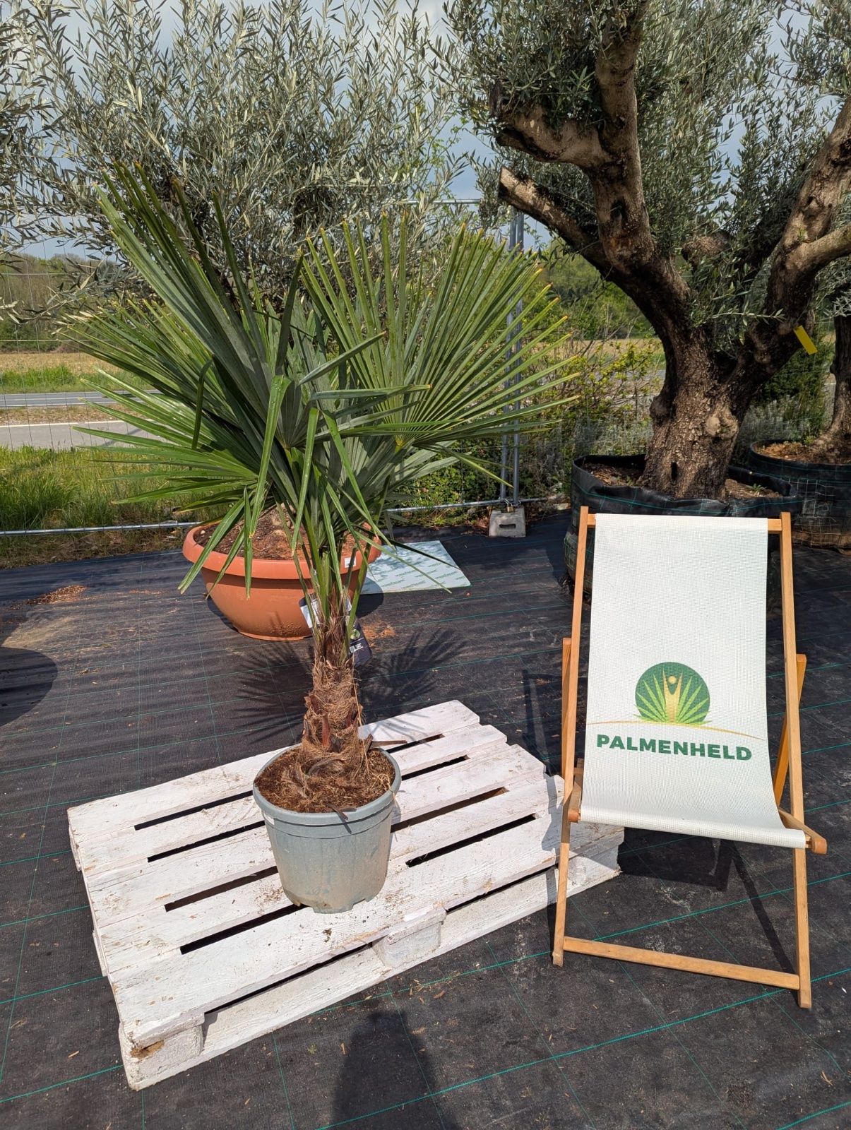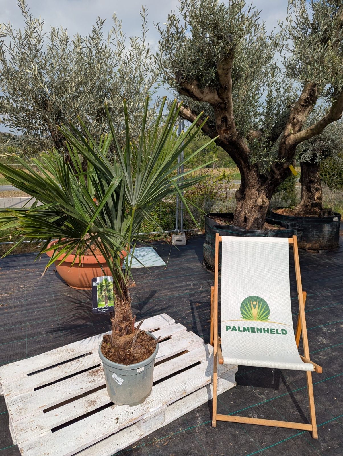 Robuste, winterharte Fächerpalme mit kräftigem Stamm und immergrünen Wedeln – ideal für Garten, Terrasse und Innenhof. Lieferhöhe 130–170 cm (inkl. Topf).