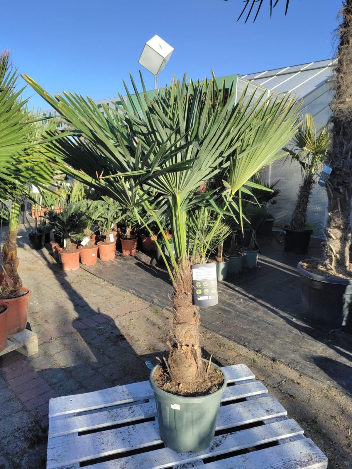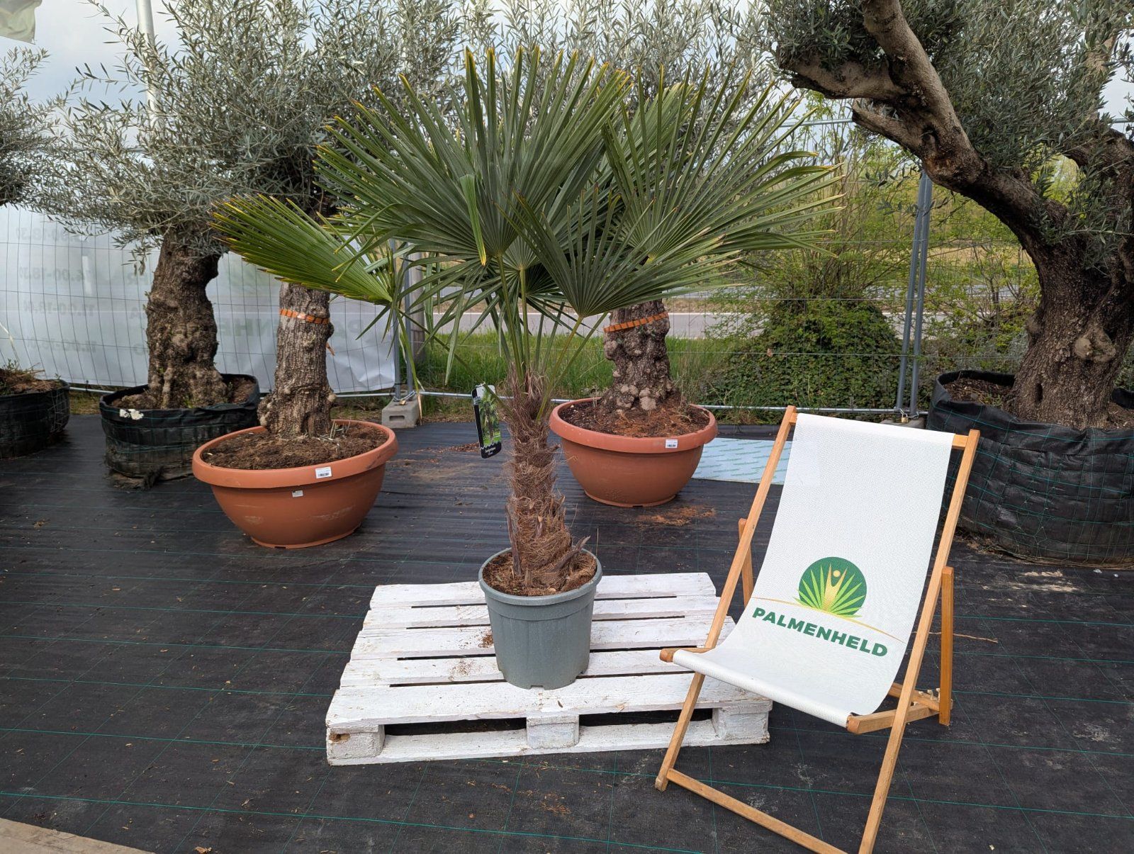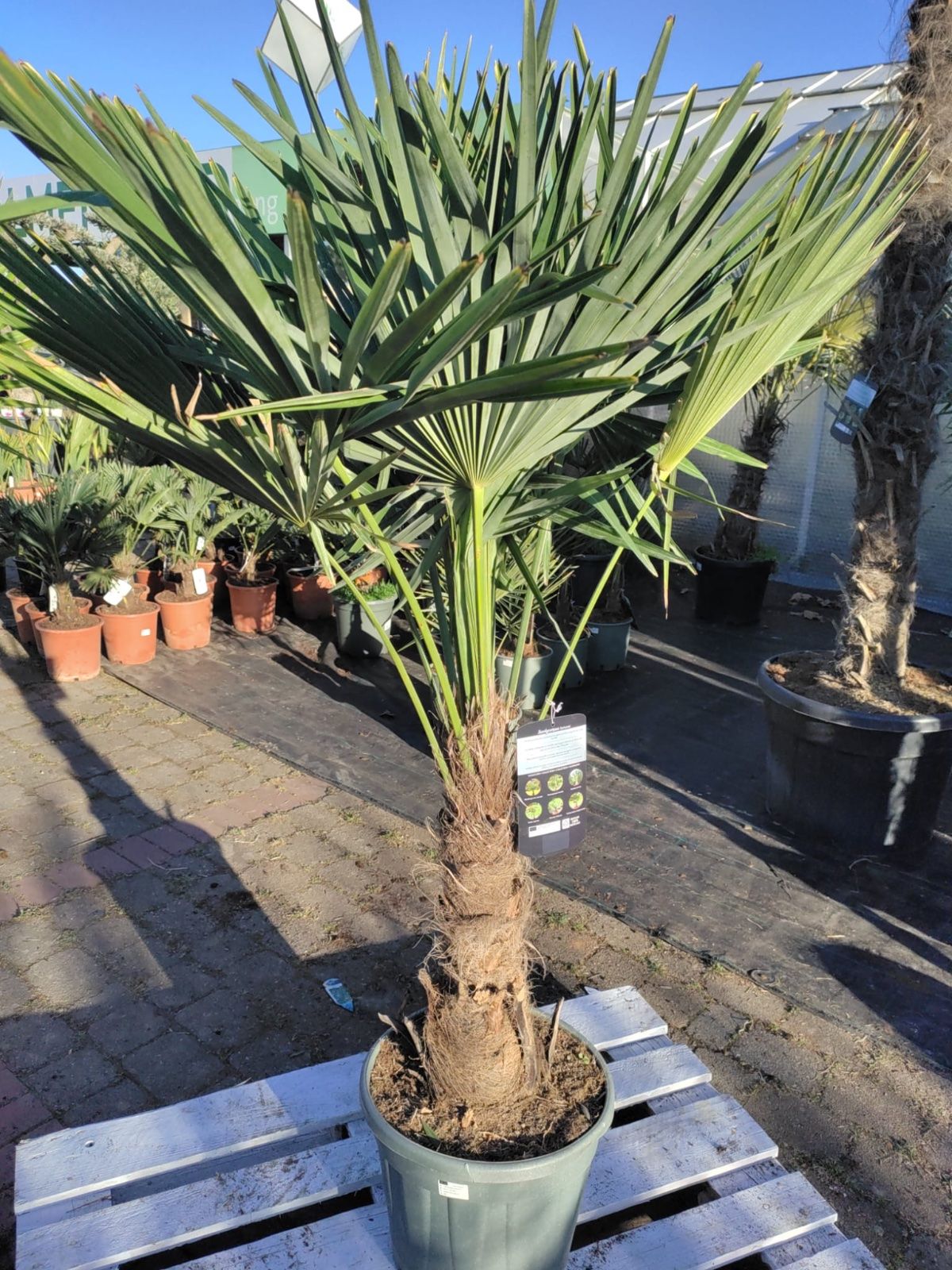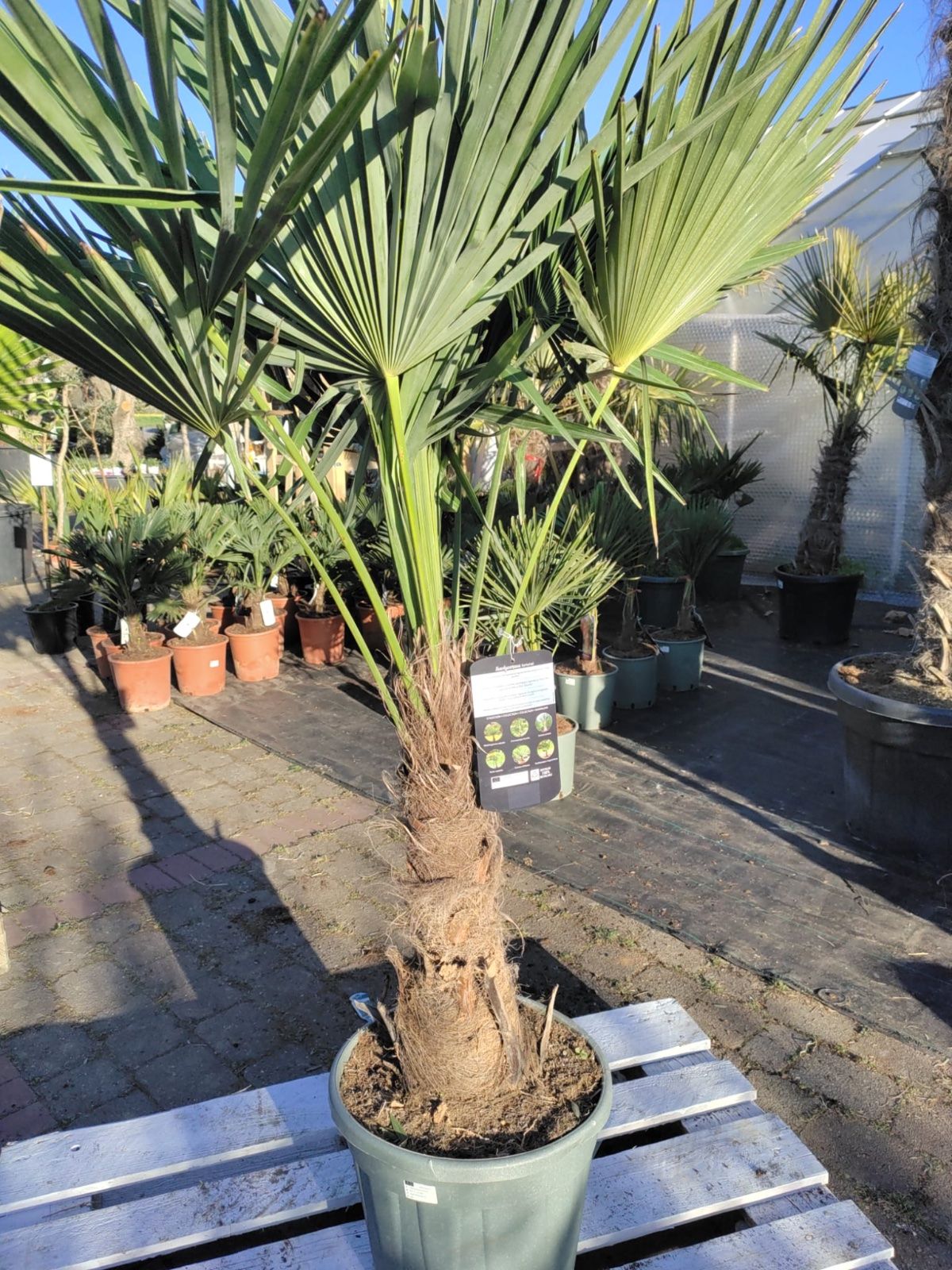 Robuste, winterharte Fächerpalme für Garten, Terrasse & große Kübel – sofort mediterranes Flair dank kräftigem Stamm und dichter Krone. Lieferhöhe 160–200 cm (inkl. Topf).