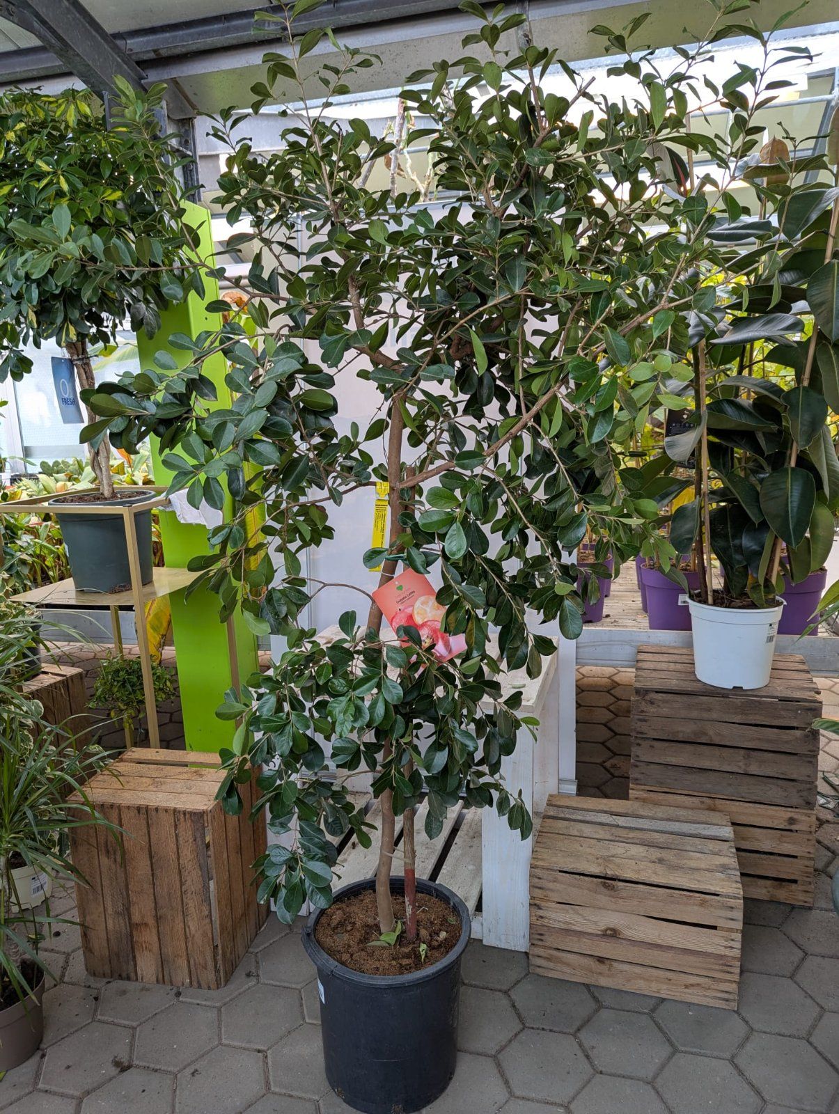 XXL-Exemplar mit immergrünem, dichtem Laub und aromatischen, roten Früchten – ideal für Wintergarten, Terrasse und sonnige Balkone. Lieferhöhe 180–220 cm (inkl. Topf).