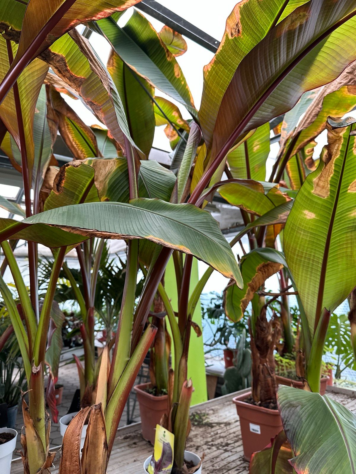 Spektakuläre Zierbanane mit großen, glänzenden Blättern in intensiven Rot- bis Kupfertönen. Das angebotene Exemplar hat eine Lieferhöhe von 100–130 cm (inkl. Topf) und sorgt sofort für tropisches Flair auf Terrasse, im Gartenbeet oder Wintergarten.