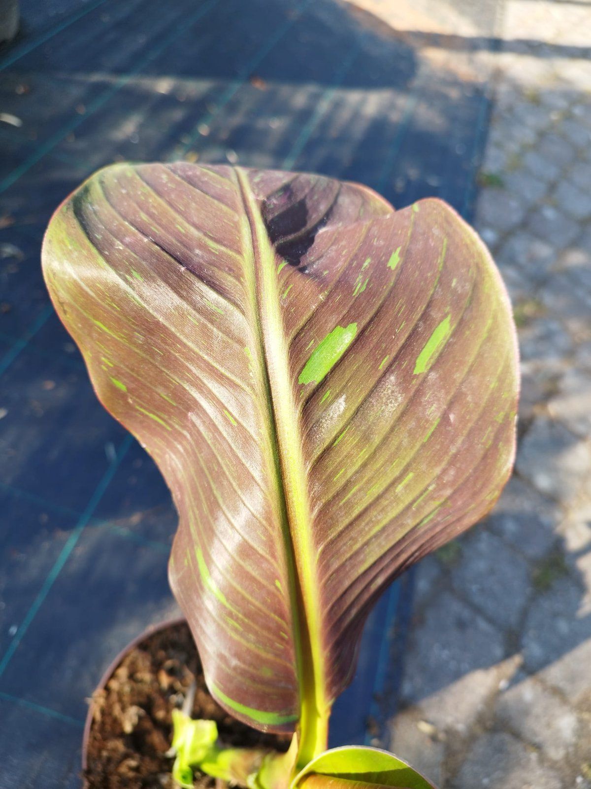 Exotische Zierbanane mit auffallend roten Blättern und gelb-grüner Zeichnung – ein farbstarker Blickfang für Wintergarten, Terrasse und Balkon. Lieferhöhe 70–90 cm (inkl. Topf).