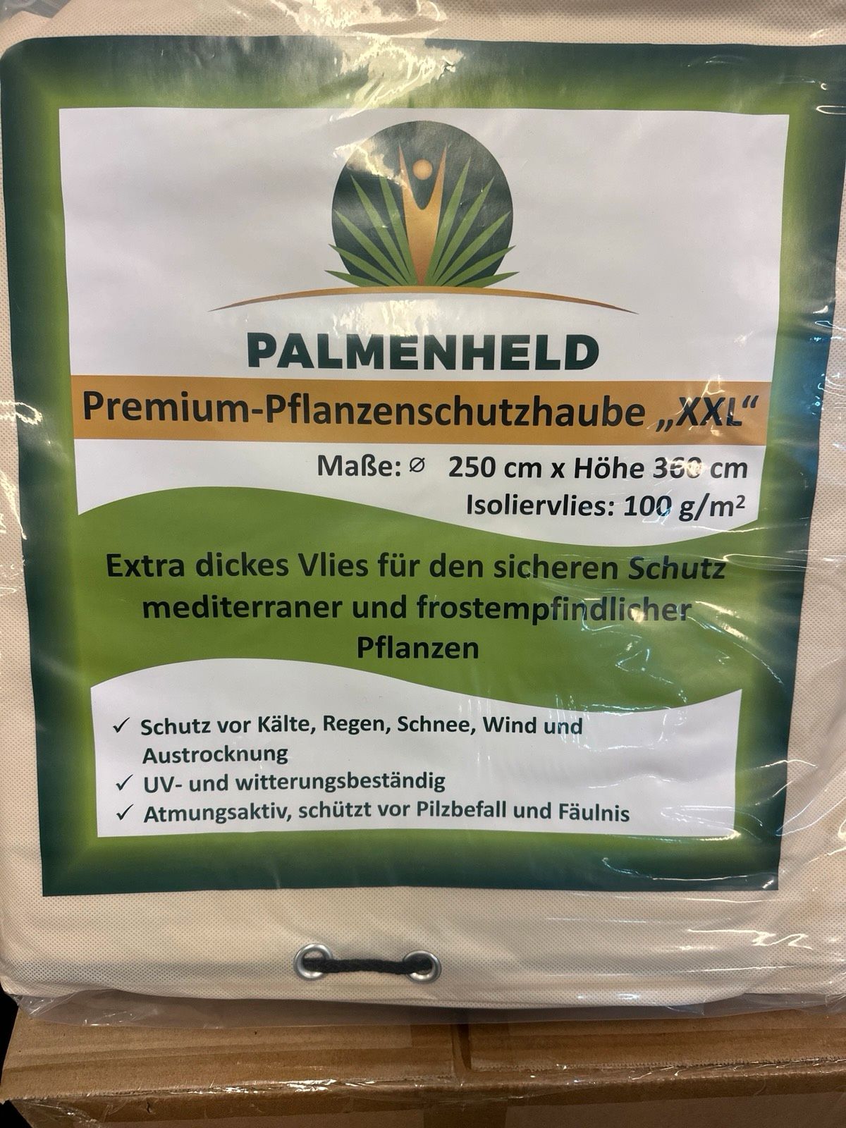 Extra großes Premium-Winterschutzvlies (100 g/m²) für hohe Palmen, Oliven & mediterrane Pflanzen – schützt zuverlässig vor Frost, Wind und Wintersonne. Größe 250×360×360 cm.